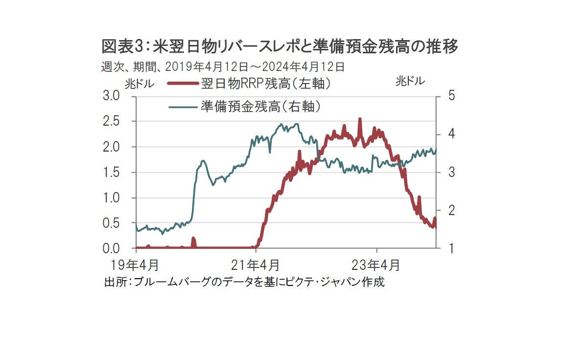 なお、準備預金残高はQEの局面では増加、QTの局面では減少するのが通常だ。しかし、今回のQT局面で準備預金残高は緩やかながら増加している(図表3参照)。かく乱要因は「翌日物リバースレポ(RRP)」だ。RRPはFRBが保有する国債を担保に銀行から資金を借りて、翌日に一定の金利を付けて返す仕組みだ。21年ごろからRRPの主な運用主体であるMMF(マネー・マーケット・ファンド)はRRPへの投資を増やした、その反動で準備預金残高の伸びは抑制された。反対に23年半ばからMMFは投資先をRRPから運用利回りの良い短期国債へシフトした。この時期FRBはQTを進めていたことから、本来、準備預金残高は減少すべきだが、RRP減少に伴い準備預金残高は緩やかながら増加した。ただ、足元でRRPの残高はゼロに近づいている。それでも従来のペースでQTを続ければ準備預金残高が急減し、流動性不足が懸念されるだろう。QT縮小は、利下げ開始に関係なく、比較的早期に実施される可能性も見ておくべきと筆者は考えている。