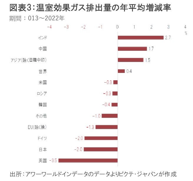 ちなみに、2022年までの10年間における温室効果ガス排出量の年平均増減率を国、地域別に見ると、英国▲3.5%、日本、ドイツ▲2.0%、米国▲0.3%であり、先進国は新型コロナの影響もあって軒並み減少傾向になった(図表3)。一方、インドは年率2.7%、中国も同1.7%の増加で、排出拡大の主役が新興国に移ったことは明らかだ。