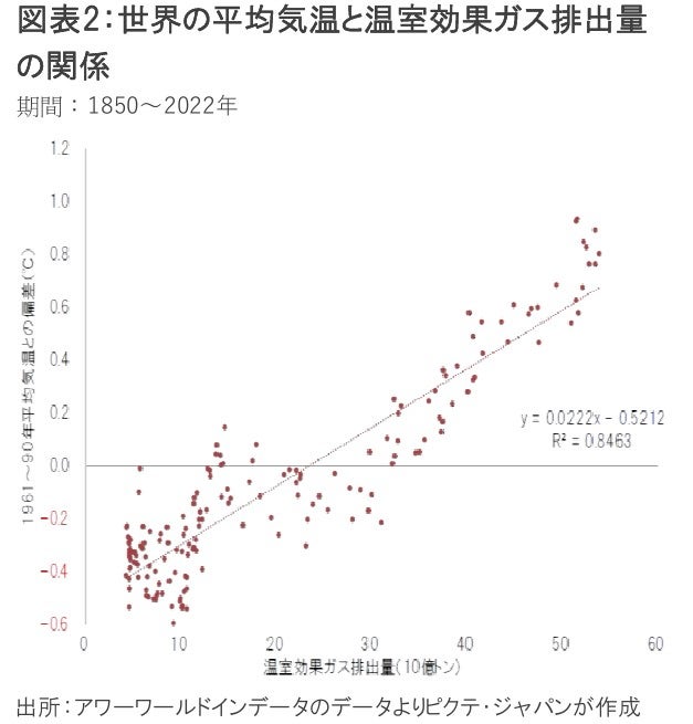 一方、1850年以降の温室効果ガス排出量と気温の関係を見ると、一次回帰直線の決定係数(R )が0.84に達している。温暖化の要因については、科学者の間にも様々な見解があったものの、気候変動に関する政府間パネル(IPCC)は、2022年8月に公表した『第6次評価報告・第1作業部会報告書』において、「人類による活動の影響が気候システムを温暖化させてきた」ことについて、「疑う余地はない」と断定した。それだけ科学的な検証が進んだと言えるだろう。
