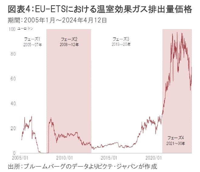 先進国内では、カーボンプライシングを活用、温室効果ガス排出量削減と産業競争力の強化への取り組みが進められている。この点で国際社会をリードしてきたのはEUだ。2020年12月には、排出量の削減目標を従来の1990年比40%から55%へ大きく引き上げた。その結果、未達の企業が続出するとの観測から、2005年の発足以降、低調を続けていた欧州排出量取引システム(EU-ETS)で排出量価格が急騰している(図表4)。