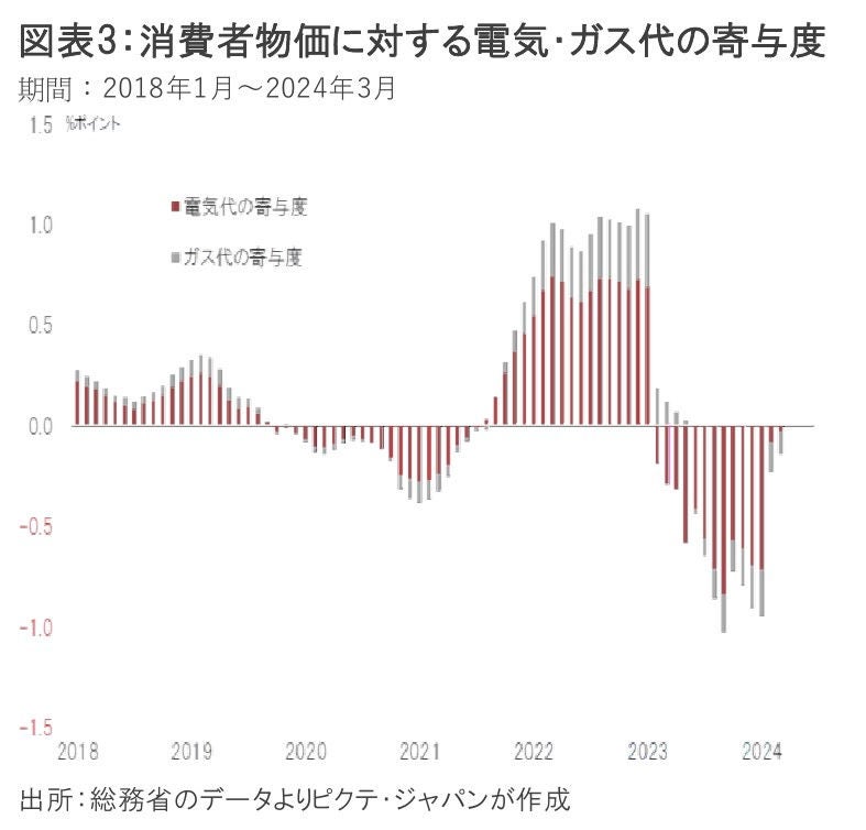 今夏に向け、円安以外に物価を押し上げる明確な要因がもう1つある。それは、『電力・ガス価格激変緩和対策事業』の終了だ。岸田政権による同事業により、2023年1月から8月使用分については、電力の場合1kWh当たり7.0円の補助金が給付されていた。その結果、2023年9月には、電気代の消費者物価全体に対する寄与度は▲0.8%ポイントに達している(図表3)。