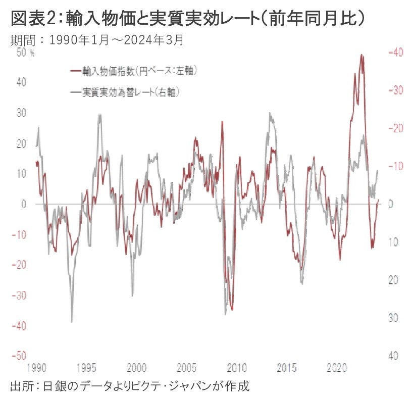 資源・原材料の多くを輸入に依存する日本は、企業物価全体に占める輸入品のウェートが18.9%に達し、為替が物価全般に及ぼす影響は無視できない。過去の例では、実効為替レートの変動が、輸入物価の動きに大きく作用してきた(図表2)。