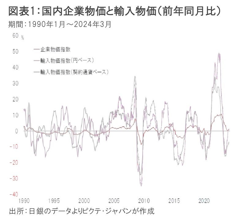 足下、契約通貨ベースだと輸入物価は前年同月比6.9%低下している。他方、円ベースだと1.4%上昇しているのは、明らかに円安の影響だ。