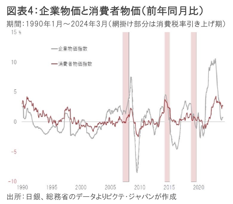 新型コロナ期を通じて起こった日本経済の変化の1つは、企業による価格転嫁ではないか。少なくともコスト上昇分の一部が販売価格に上乗せされるようになった結果、消費税率引き上げの影響を除き、バブル崩壊以降で初めて消費者物価上昇率が3%台に乗せた(図表4)。円安により輸入物価が上昇した場合、企業の価格転嫁を通じて、消費者物価の上昇圧力がさらに強まるだろう。
