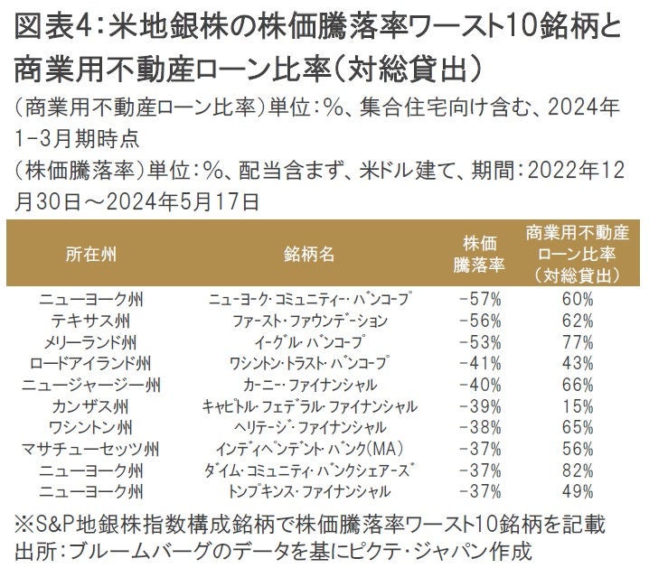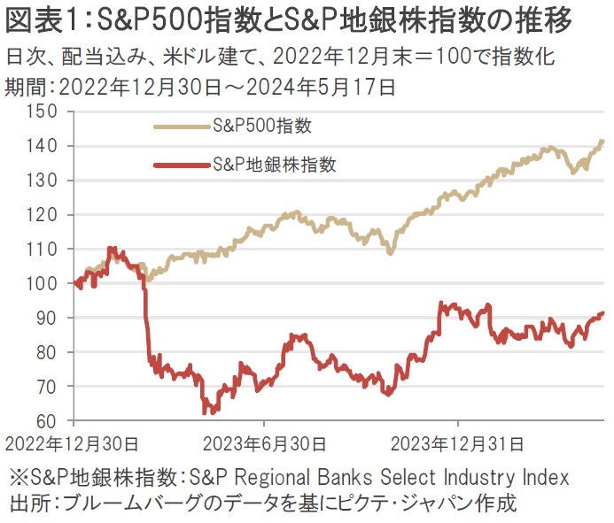 S&P500指数が最高値を更新する中、S&P地銀株指数は昨年3月に発生した米シリコンバレーバンク破綻前の株価水準を回復できずにいる(図表1)。