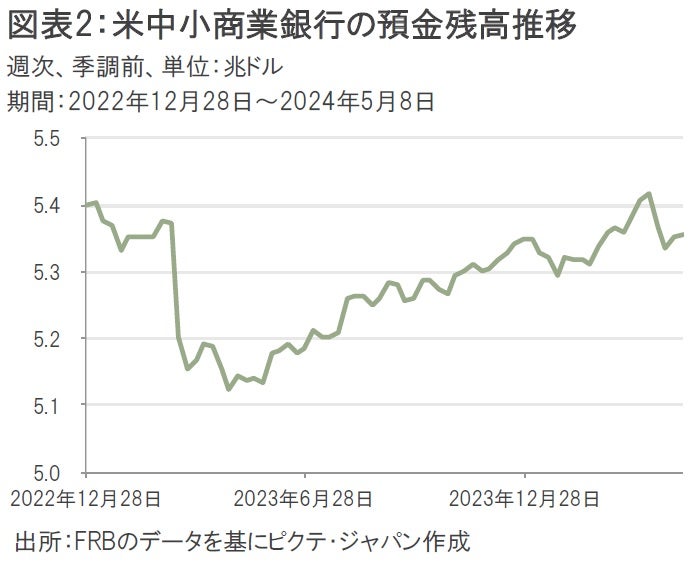この状況はマクロ統計にも表れている。米中小商業銀行全体の預金残高は、2023年3月8日時点の5.37兆ドルから同年4月26日時点の5.13兆ドルへ、約2,480億ドルも減少した(図表2)。だが、その後はどうだろうか?