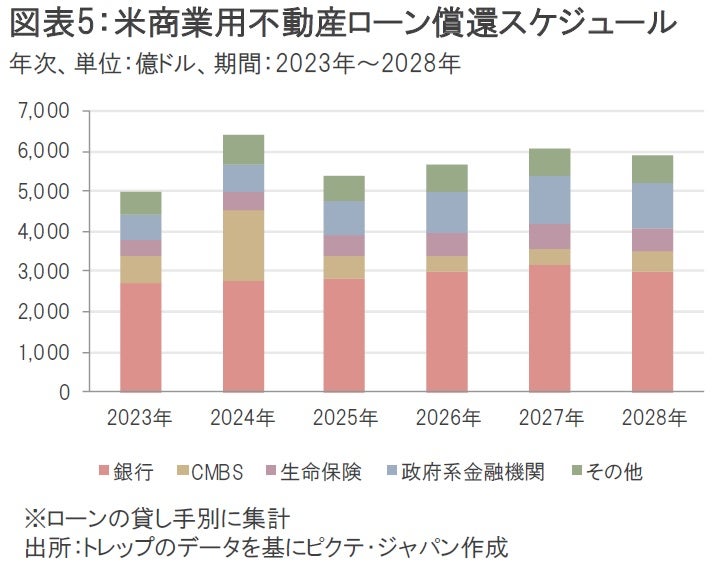 今年償還を迎える米商業用不動産ローンのうち、全体の43%を銀行が貸し出している(図表5)。