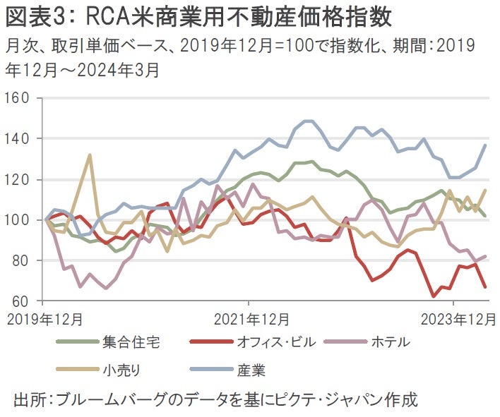 米国ではアフターコロナにおけるリモート環境の定着(空室率上昇)や借入金利の上昇等によって特にオフィス・ビルの取引単価が低下傾向にあり、市場では不動産価値が借入元本を大幅に下回るリスクが警戒されている(図表3)。