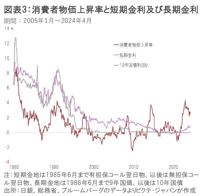 長いデフレ時代における経験から、長短名目金利はゼロ近辺であることが当たり前になったが、理論上、名目金利がインフレ率を上回り、実質金利はプラスでなければならない。1990年代央以降のデフレ期でも、消費税率引き上げによる一過性の要因を除けば、実質長期金利は概ねプラスゾーンで推移していた(図表3)。しかし、日銀が大胆な政策転換を図るとは考え難く、今後も円安とインフレが続く可能性が高いと考えられる。