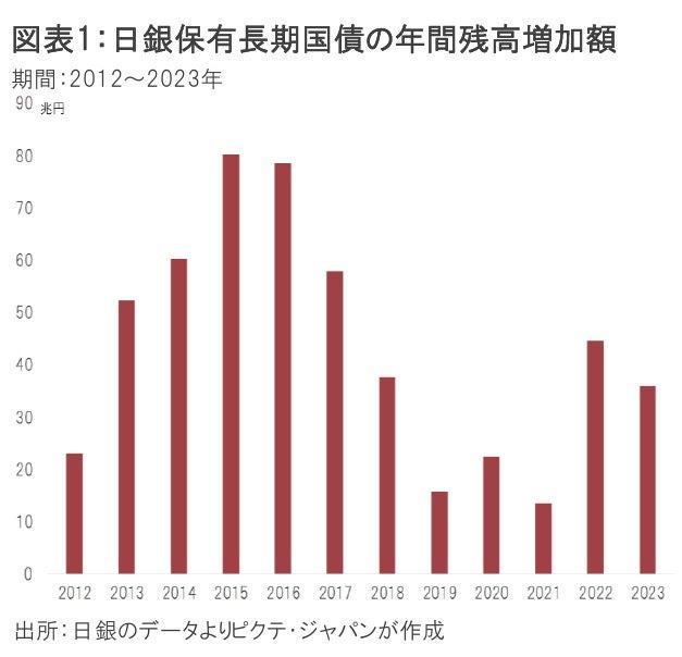 実績を見ると、日銀の長期国債保有残高増加額は、2015年の80兆2,577億円、2016年の78兆6,346億円をピークに縮小に転じ、2021年には13兆5,154億円となった。YCCに込められた意図は半ば達成されたかに見えたのである。