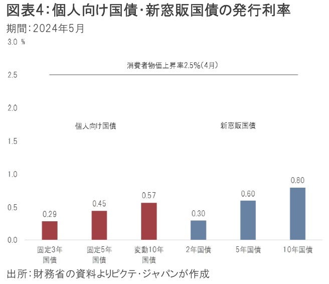 2024年度の国債発行計画によれば、今年度の個人向け国債は3兆5千億円の発行予定だ。財務省が作成した個人向けのパンフレットを見ると、「元本割れなし、不安なし」、「国が発行、とにかく安心」と説明が書かれていた。ただし、満期まで物価が日銀の目標とする2%を安定的に超えた場合、購買力としての価値が低下する結果、実質ベースで損失を被るリスクに関しての説明はない。