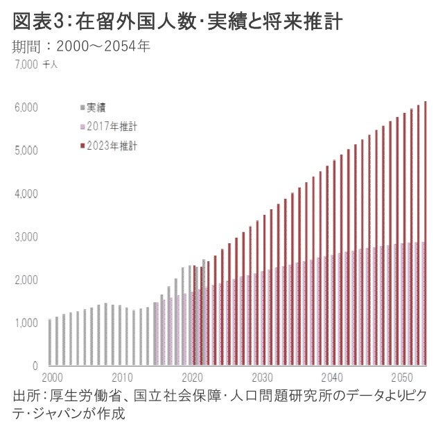 今年度は5年に1度の公的年金財政検証の年である。それに先立ち、昨年4月に発表された最新の将来人口推計を見ると、30年後の2054年における総人口に関し、2017年推計より減少幅が233万人縮小していた。出生率の低下に伴って、日本人の減少幅は71万人拡大したものの、在留外国人が154万人増から458万人増へと大きく上昇修正された結果だ(図表3)。
