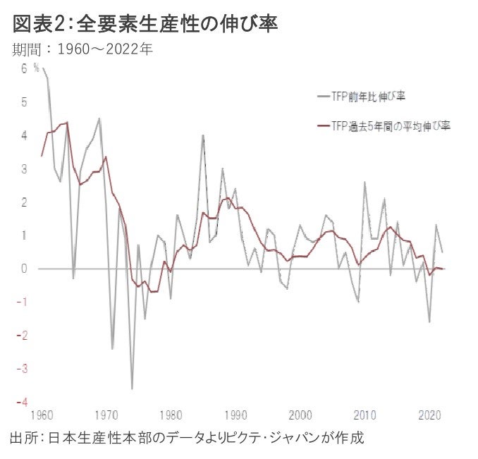 一方、2012年12月に発足した第2次安倍政権は、全要素生産性(TFP)の改善をマクロ政策の柱の1つとした。しかしながら、2013年以降の10年間、TFPの伸びは年平均0.4%に止まっている(図表2)。過去5年間だと横ばいだ。