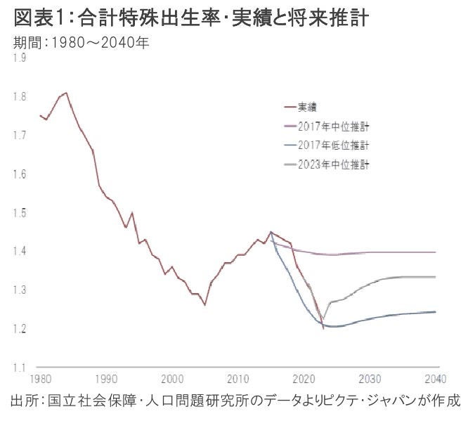 6月5日、厚労省が発表した『人口動態統計概況』によれば、昨年の出生数は72万7,277名、合計特殊出生率は1.20であり、いずれも過去最低を更新した。昨年4月に国立社会保障・人口問題研究所(IPSS)が示した最新の将来人口推計では、2023年の合計特殊出生率について、中位推計で1.37としていた(図表1)。また、2019年度の年金財政検証の前提とされた2017年版だと、中位推計で1.66、低位推計で1.21だ。新型コロナ禍の影響もあり、日本の人口は想定以上のペースで減少しつつある。