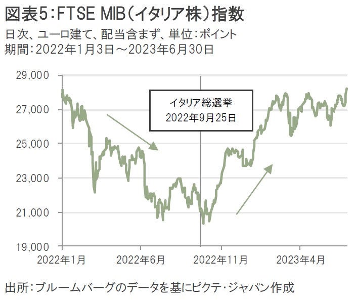 しかし、この「危険な賭け」に負けたとしても、その影響が限定的になる可能性もある。2022年9月25日に行われたイタリアの総選挙では、ジョルジャ・メローニ党首率いる極右政党「イタリアの同胞(FDI)」が第1党となり、メローニ氏が首相に就任した。イタリア株式市場は当初、極右政権の誕生を嫌気して軟調に推移したが、メローニ政権の堅実な政策運営が市場に評価されるにつれて、株価は回復基調に転じた(図表5)。