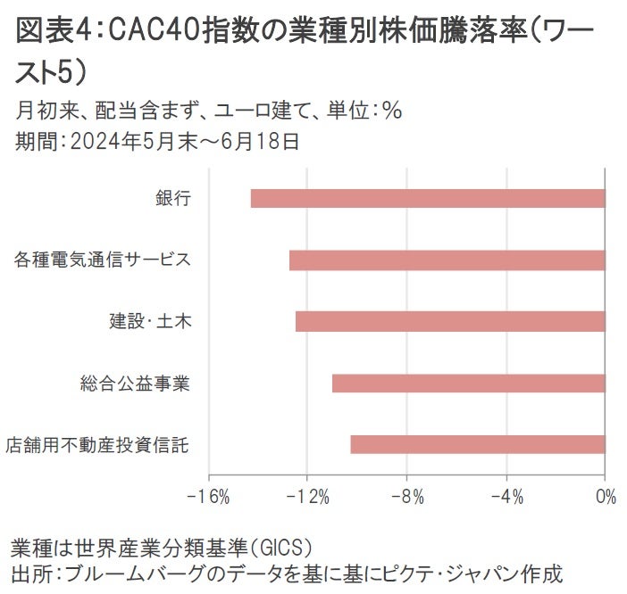 そのCAC40指数における月初来の業種別株価騰落率を見ると、銀行や建設・土木セクターなどの株価が大きく値下がりしていることが分かる(図表4)。