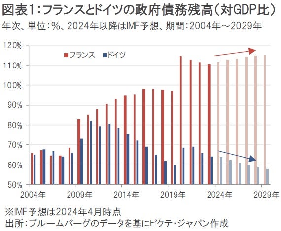 仏総選挙で極右政権が発足すると、ポピュリズムに基づく財政拡張政策が採用され、政府債務残高が一層膨らむことが懸念されている。元々、IMF(国際通貨基金)はフランスの政府債務がGDP比で増加すると予測していたが、極右政党や左派連合の台頭により、この政府債務の悪化傾向がさらに加速するシナリオが金融市場で警戒されている(図表1)。