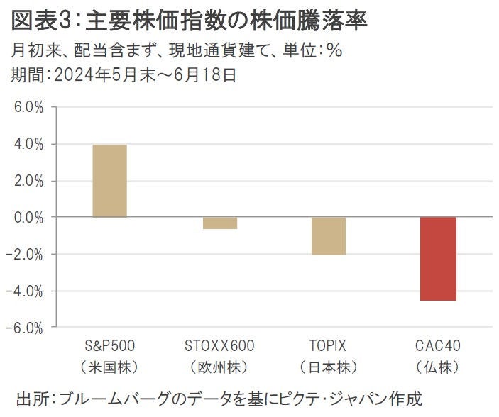 フランスの政治リスクが高まる中、投資家は当初リスクオフの姿勢で反応した。しかし、その後はマリーヌ・ルペン氏が総選挙での勝利後もマクロン大統領を追い出す意図がないと述べたことなどが報道された結果、17~18日のフランス株式市場はやや落ち着きを取り戻す展開となった。