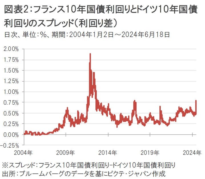 実際、債券市場ではドイツの10年物国債利回りに対するフランスの10年物国債利回りのスプレッドが、6月18日時点で0.77%まで上昇し、2017年(フランス大統領選挙前に極右政党のマリーヌ・ルペン候補が高い支持を集めていた時期)以来の高水準に達した(図表2)。