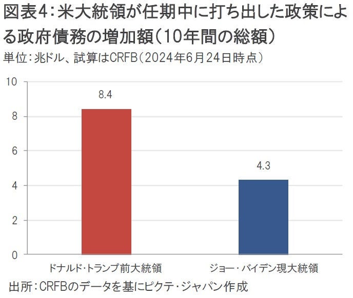 なぜトランプ氏再選の可能性が市場関係者に財政赤字拡大の警戒を促すのか?米超党派のシンクタンク「責任ある連邦予算委員会」(Committee for a Responsible Federal Budget)によれば、トランプ前大統領が任期中に打ち出した政策による政府債務の増加額は10年間で約8.4兆ドルと試算される一方、バイデン現大統領の場合は10年間で約4.3兆ドルにとどまる(図表4)。前例にならえば、トランプ氏の方が財政負担が増えると予想するのは自然な流れだろう。