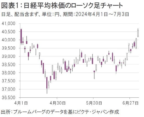 7月2日(火)の日経平均株価(終値)は前日比1.12%高の40,074円69銭となり、約3カ月ぶりに4万円台を回復する展開となった(図表1)。米ドル高・円安が日本株上昇に寄与しないと言われて久しい中、なぜ日経平均株価は再び4万円台まで回復したのか?そのカギを握るのは10年国債利回りの上昇だ。