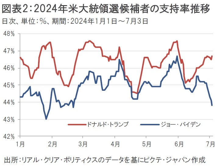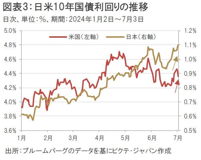 この討論会後に行われた米大統領候補者の支持率調査では、トランプ氏がバイデン氏に対してさらにリードを広げる結果となった(図表2)。今年11月5日(火)の米大統領選まで約4カ月もあるため、両候補者の支持率が今後大きく変わる可能性はあるものの、金融市場は早くもトランプ氏再選の可能性を織り込み始めている。それが端的に表れているのが日米の10年国債利回りの上昇だ。