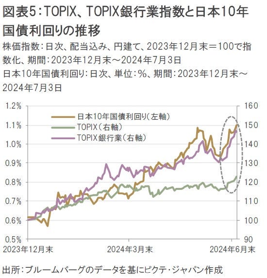 一般的に長期金利が上昇すると銀行株のパフォーマンスは向上する傾向にある。日本の10年国債利回りとTOPIX銀行業指数のパフォーマンスを比較すれば、この傾向は足元の相場にも当てはまることが分かる(図表5)。この銀行株の上昇が、TOPIXおよび日経平均株価を押し上げる材料になったと考えられる。