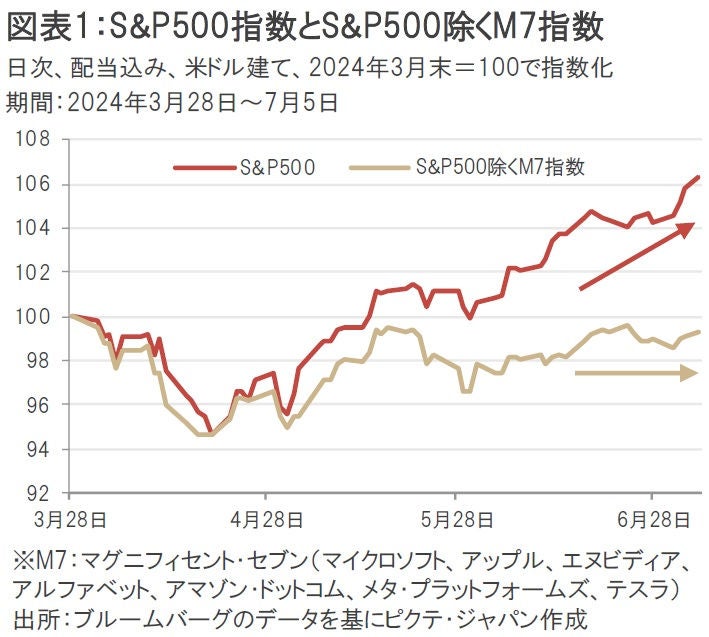 マグニフィセント・セブン(M7:マイクロソフト、アップル、エヌビディア、アルファベット、アマゾン・ドットコム、メタ・プラットフォームズ、テスラ)と呼ばれる米国の超大型成長株の株価パフォーマンスが一段高の展開となっている。S&P500指数と、M7銘柄を除いたS&P500指数の株価指数を比較すると、今年5月以降、S&P500指数のパフォーマンスが優位になっていることが分かる(図表1)。