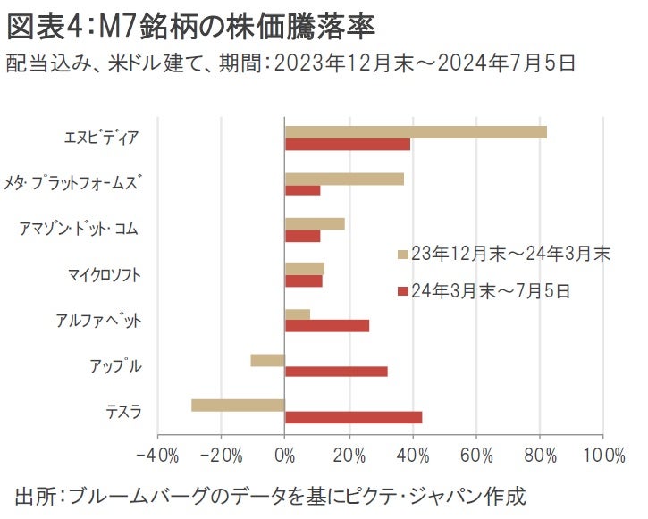 これまでM7銘柄の中でもエヌビディア株がダントツの株価パフォーマンスを示してきた。23年12月末から24年3月末までの株価騰落率(配当込み)は+82%で独り勝ちの状態となり、まさに生成AIブームを象徴する銘柄となった(図表4)。しかし、直近約3カ月の値動きを見ると、やや様子が異なる。特に大きく上昇したのがテスラ株だ。競合する中国の電気自動車メーカーの6月納車台数が前月比で増加したことをきっかけにテスラの納車台数に対する期待が高まったほか、その後に発表されたテスラの4-6月期の納車台数が市場予想を上回ったことなどから、株価は急騰する展開となった。24年3月末から7月5日までの株価騰落率(配当込み)はエヌビディア株が39%高に対し、テスラ株は43%高だった。
