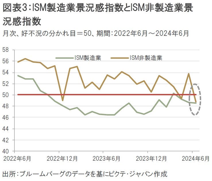 M7銘柄の株価パフォーマンスが相対的に優位になっている理由の一つとして、米国の景況感の悪化が挙げられる。6月のISM製造業景況感指数とISM非製造業景況感指数がともに好不況の分かれ目である50を下回ったため、足元の景気循環の影響を相対的に受けにくいと考えられるAI(人工知能)関連銘柄のM7への資金シフトが進んだと考えられる(図表3)。