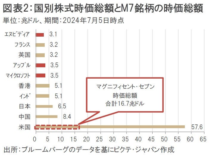 この結果、M7銘柄の時価総額は7月5日時点で約16.7兆ドル(約2,678兆円)にのぼり、米国株の時価総額全体に占める割合は28.9%とおよそ3割に迫る(図表2)。ちなみに、マイクロソフト、アップル、エヌビディアの3銘柄だけで時価総額は合計約10兆ドル(約1,607兆円)になり、中国全体の時価総額8.4兆ドルを大きく上回る。もはやM7銘柄は米国外のどの単一国よりも存在感が大きい。