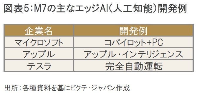 M7の中では、これまでGPUを手掛けるエヌビディアや「クラウドAI」サービスを提供するアマゾン・ドットコム、アルファベット、マイクロソフトなどが生成AIブームの恩恵を先行して享受してきた。しかし、今後はこれに加えて、「エッジAI」という幅広い顧客層をターゲットにしたAIサービスが普及するシナリオが浮上してきた。ここ数カ月に見られたアップル株やテスラ株の上昇には、このようなポテンシャルが一部反映されている可能性があるかもしれない。