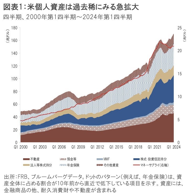 米国の個人資産は過去に例を見ないペースで膨張している(図表1)。過去10年間で個人の総資産は87%、80兆ドル増加し、2024年3月末時点で170.9兆ドル(2京7346兆円、1ドル=160円で換算)まで拡大した。米国の個人資産は、長期的にみるとマネーサプライの増加と概ね呼応しているが、足元ではその縮小にもかかわらず膨張を続けている。