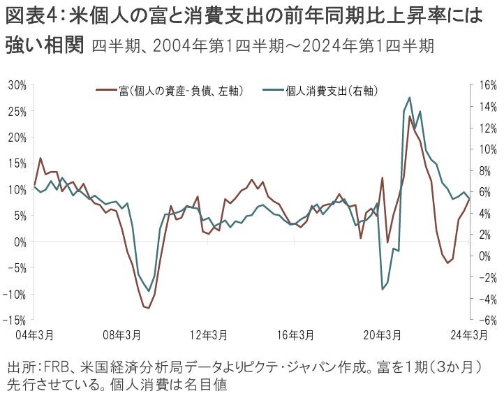 第二に、資産価格が膨張することに伴う心理的な効果、いわゆる資産効果も消費を支えてきたと考えられる。図表4の通り、米国の個人の富(=個人資産から負債を差し引いた金額)の変動率は、翌期の名目消費の増減率と強い相関がある。過去20年間でみると、個人の富が1ドル増加すると、3か月後の個人消費は1~2セント押し上げられている可能性がある(雇用者報酬の増減の影響はコントロール<排除>している)。