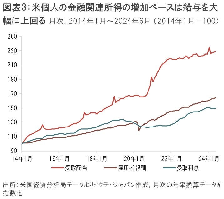2024年第1四半期に個人が受け取った金利収入は10年前の1.5倍となった、配当収入の伸びはさらに大きく、2.2倍に増加した(図表3)。この間、雇用者報酬も1.6倍となったが、配当の伸びはこれを上回る。配当収入の増加は金額にして1.0兆ドル、167兆円にも上る。個人の配当収入は、2020年に史上初めて預金の金利収入を上回った(データがある1960年以降)。なお、これらの個人所得には株式や不動産の売却益は含まれていない。これらを含めれば、個人の金融関連所得と、これに伴う個人消費の押し上げの力はさらに大きかったと考えられる。