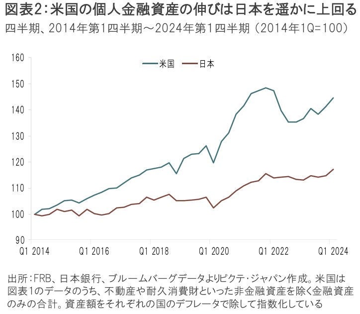 因みに、日本の金融資産も増加しているが、図表2のとおり、インフレ率を控除しても、米国の伸びは日本とは比較にならないほど大きい。