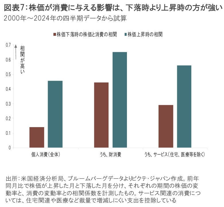 逆に、もし資産が一時的に減少した場合でも、個人消費の大きな落ち込みに繋がるとは限らない。資産価格下落の消費への影響は、上昇時ほど大きくないことを示すデータも多いためだ(図表7)。消費の“ラチェット効果”、つまり一度身についた消費の習慣は容易には変えられないことが背景にある。