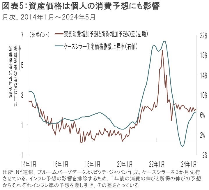 足元の米国の消費者の1年後の支出の伸びの予想は、所得の伸びの予想を2ポイント程度上回っており、個人の強い消費意欲を表している(図表5。インフレ予想は控除している)。背景に、一時的に下落したものの、その後堅調さを取り戻した住宅価格等があると思われる。過去にも、個人が実質所得の伸びを上回る消費を予想していた時期には、住宅などの資産価格が上昇していたためである。