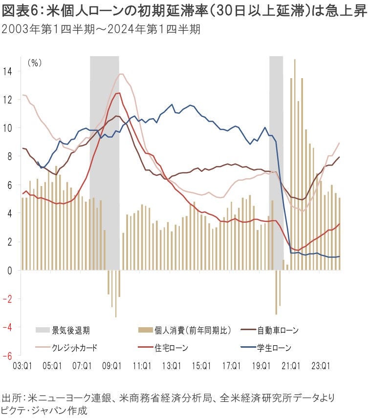 一方、個人消費への懸念材料としては、労働市場の軟化等に加え、ローンの延滞急増が挙げられる(図表6)。特に、クレジットカードローンで初期延滞の増加が目立つ。米国では個人消費に対するカードの利用率が高いため、金融機関が慎重になれば、個人消費には他国以上のマイナスとなる。