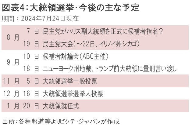 ちなみに、民主党は、8月19日から22日までシカゴにおいて党大会を開催する(図表4)。ただし、11月5日の本選が3ヶ月半後に迫るなかでの候補者交代を受け、8月7日頃までにオンラインで代議員による投票を行い、ハリス副大統領を正式に候補者へ指名する可能性が強まった。従って、ランニングメイトと呼ばれる副大統領候補は、来週中にも決まることが予想される。