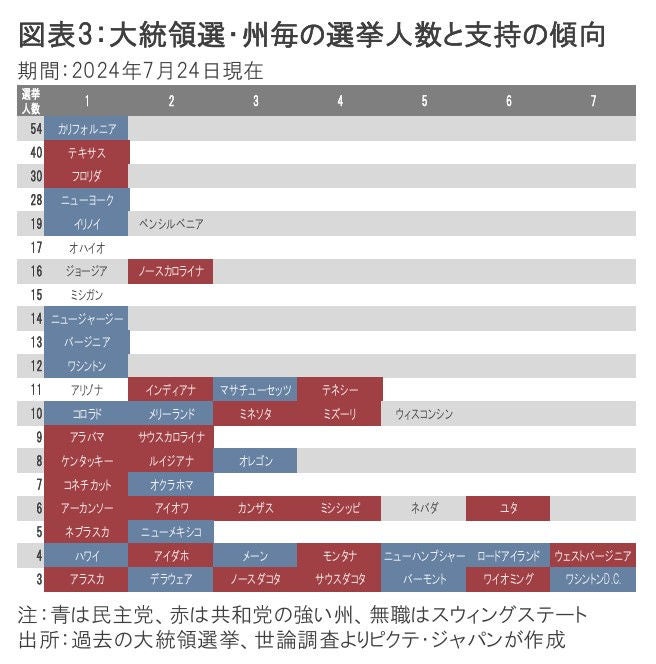 次のポイントは、ハリス氏が副大統領候補に誰を選ぶかだ。大統領選挙は50州とワシントンD.C.でそれぞれ投票が行われるが、既に多くの州は2大政党の支持による色分けが明確になっている(図表3)。そうしたなか、アリゾナ、ジョージア、ネバダ、ミシガン、ペンシルバニア、ウィスコンシンの6州がスウィングステートと呼ばれ、選挙の結果を左右する傾向が強い。ハリス副大統領は、政策や支持層と共に、地盤となる州を意識して、州知事、上院議員などから候補者を選ぶだろう。その成否は、大統領選挙に一定の影響を及ぼすのではないか。