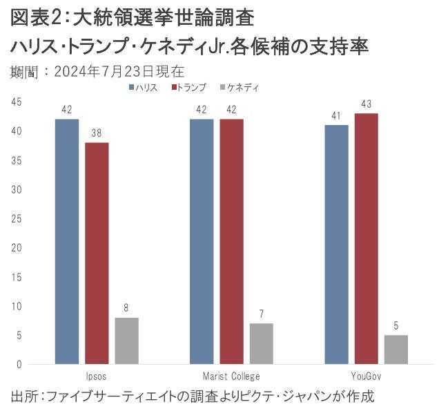 バイデン大統領が指名辞退を表明した21日以降の世論調査では、ドナルド・トランプ前大統領と支持率が互角になっている(図表2)。78歳1ヶ月のトランプ前大統領は、米国史上最高齢の大統領候補になり、59歳9ヶ月のハリス副大統領との年齢差が弱点になる可能性は否定できない。少なくともバイデン大統領の高齢を懸念していた民主党支持層は、候補者交代を歓迎するだろう。