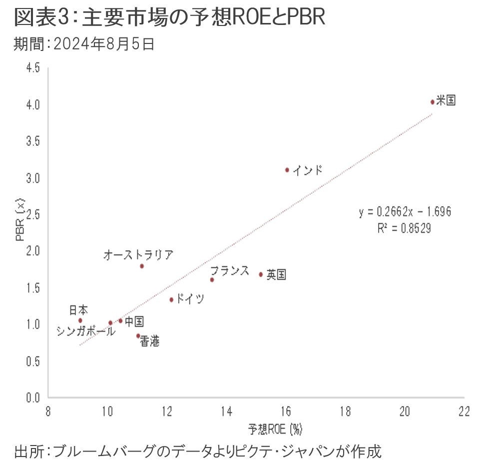 世界の主要市場間では、予想株主資本利益率(ROE)とPBRの間に強い正の相関関係が成り立ってきた(図表3)。日本企業は総じてROEが低いため、市場におけるバリューの評価も低水準であり、それは理論的にはやむを得ないものだ。
