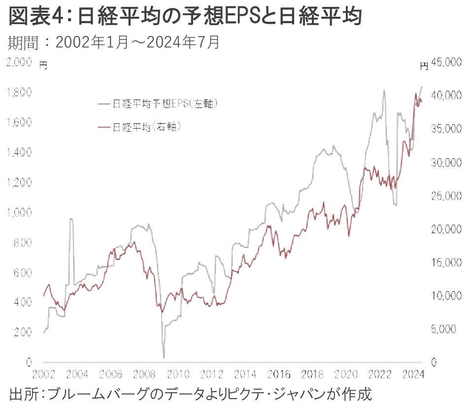 2000年代に入り、日本株はファンダメンタルズ、即ち業績を反映して動くようになった。それを端的に示すのが、日経平均と予想1株利益(EPS)の連動した動きだ(図表4)。従って、株価収益率(PER)も世界主要市場のレベルに収斂し、バブル期のように東京市場が突出することはなくなった。