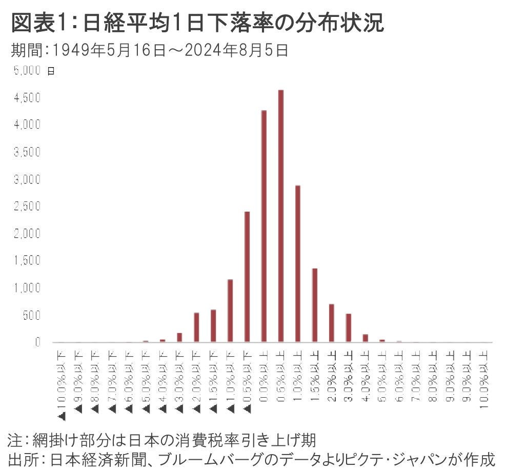 1949年5月16日に東京証券取引所が取引を開始して以来、立ち合いは8月5日で1万9,645日になった。このうち、日経平均が10%以上下落したのは4日、即ち0.02%に過ぎない(図表1)。それだけ、足下の市場は異常な状態にある。