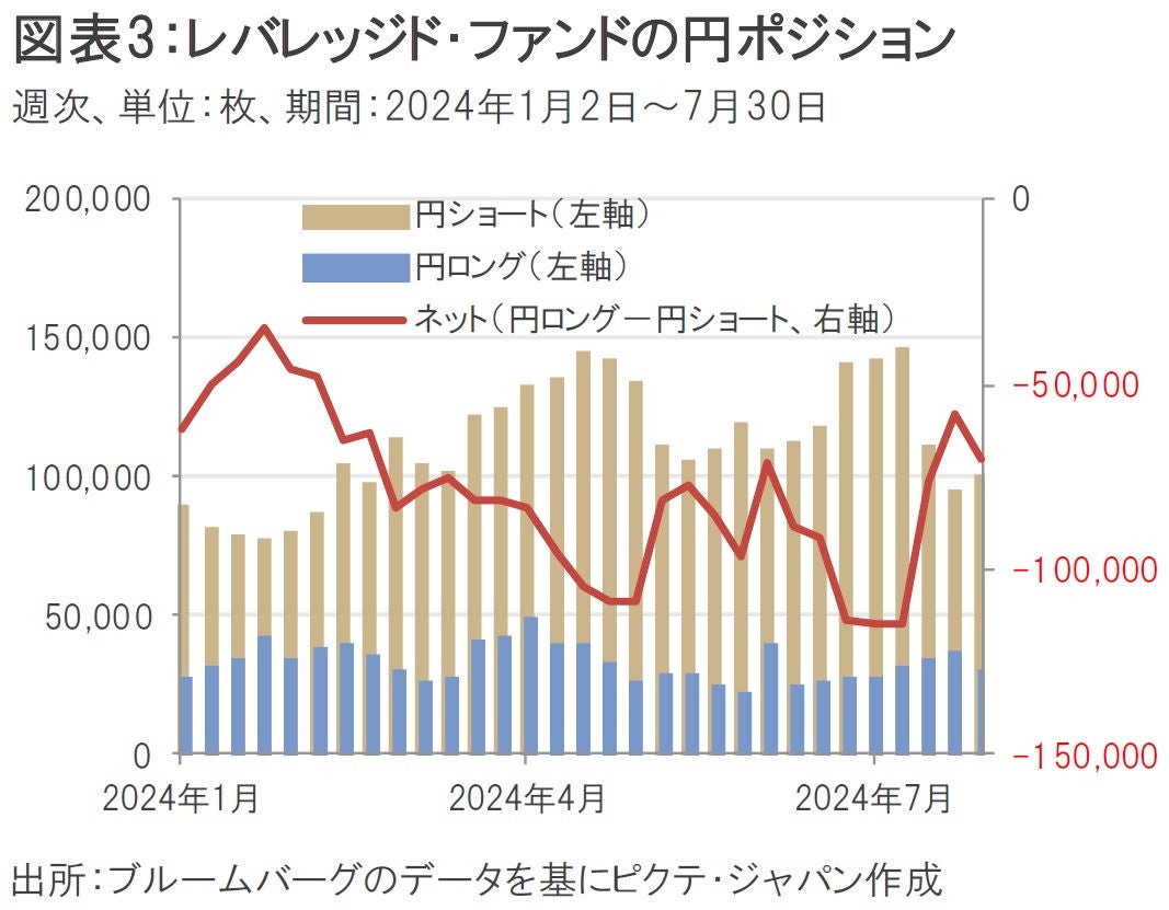 ヘッジファンドなどのレバレッジド・ファンドの円ポジションを見ると、円ロング(買い持ち)ポジションに対して円ショート(売り持ち)ポジションが、年初から7月上旬にかけて大幅に積み上がっていたことが分かる(図表3)。これが7月11日に発表された6月米CPIの下振れをきっかけに急速に減少したわけだが、それでも7月30日時点で約7万枚ほどネット・ショートだった。8月5日の相場急変時にネット・ショート・ポジションはさらに減少したと推察されるが、依然として解消余地は残っていると考えられる。