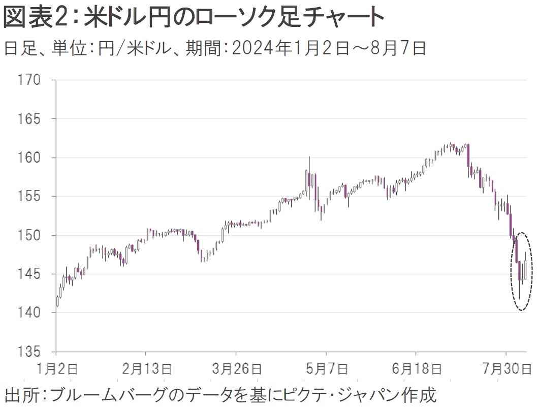 8月5日(月)の日経平均株価は前週末と比べて12.4%下落し、31,458円42銭となった(下落幅では過去最大、下落率では過去2番目の大きさ)(図表1)。この下落の背景には急激な円高進行がある。米ドル円の相場は、7月末の1ドル149円98銭から8月5日には一時1ドル141円70銭まで、円高・米ドル安が大幅に進行した(図表2)。