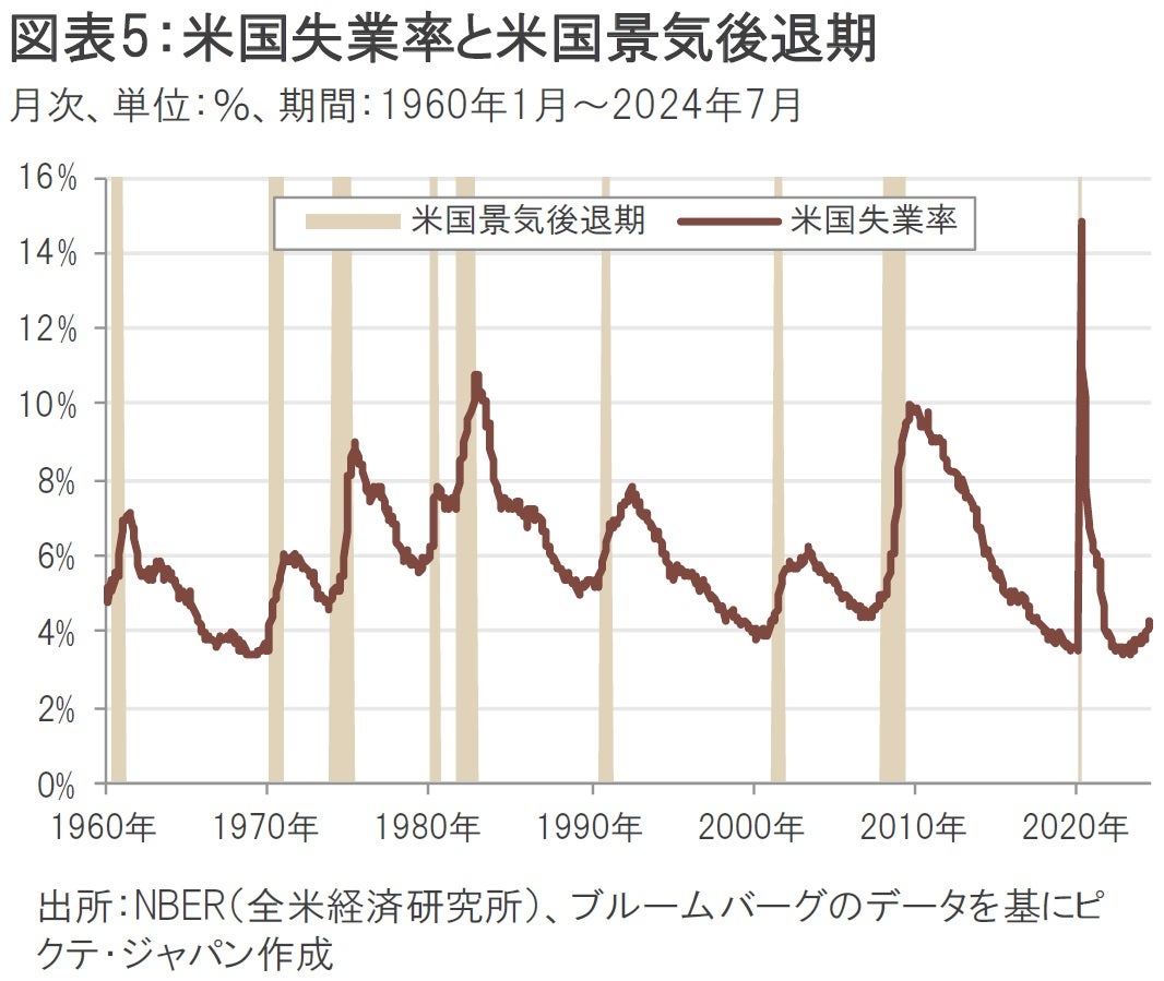 今回の急激な円高と日本株の急落は、8月2日に発表された米国の7月失業率が4.3%へ上昇したことで、米国の景気後退懸念とFRBの利下げ観測(=米ドル安観測)が同時に高まったことにも起因する(図表5)。