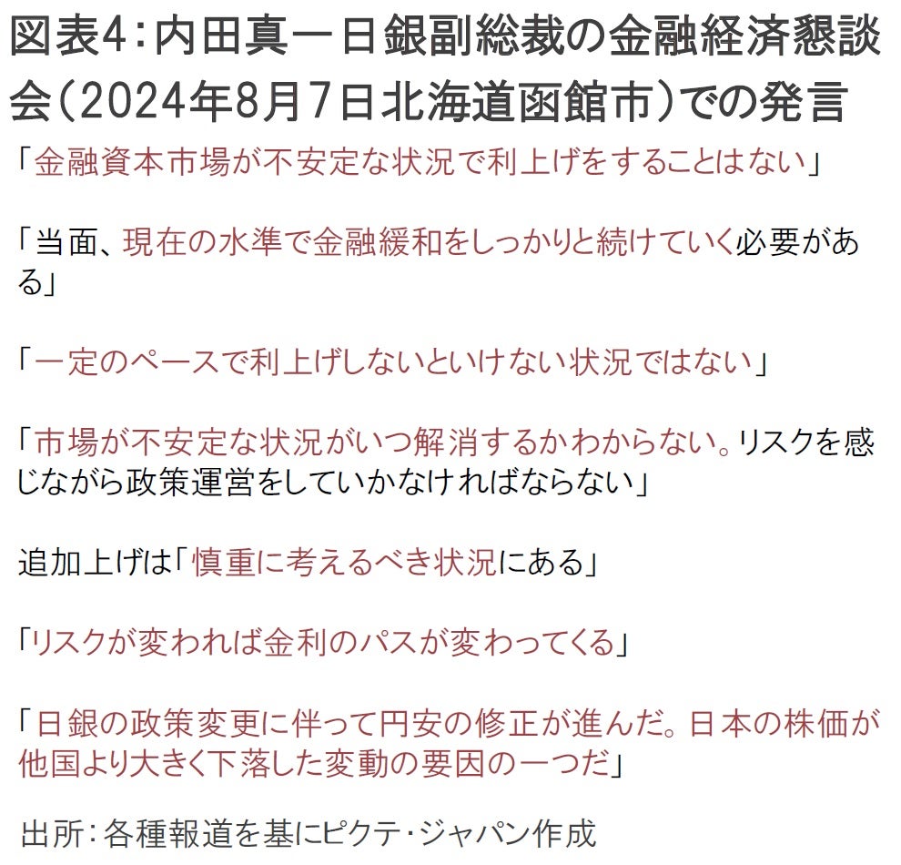 日銀副総裁の内田真一氏は、8月7日に北海道函館市で開催された金融経済懇談会で、「金融資本市場が不安定な状況で利上げをすることはない」と発言し、市場で懸念されていた日銀の早期利上げ観測を打ち消した(図表4)。