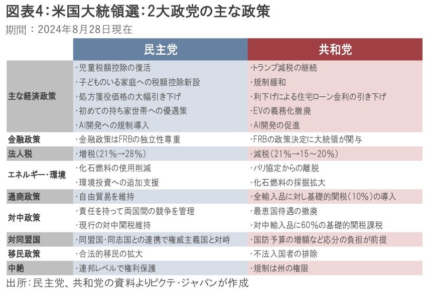 民主党、共和党がそれぞれ公表した政策綱領を見ると、民主党は中低所得者、子育て支援の減税や補助金を強化する一方、処方箋薬の薬価引き下げを強く主張している(図表4)。財源としては、法人税率を現行の21%から28%へ引き上げる案を示すなど、リベラル色を強めた印象だ。争点である移民については、合法的な移民受け入れを強化することで、暗に不法入国者への厳しい対応を示唆している。また、バイデン政権の姿勢を継続し、巨大IT企業の独占禁止に一段と注力するのではないか。「ハリス大統領領」の場合、課題は財政赤字拡大の圧力だろう。